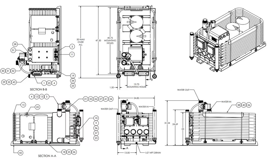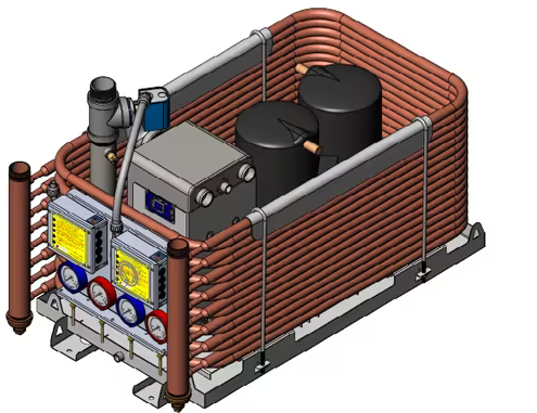 All sheet metal components are laser cut with aircraft/military quality tolerances in the ten-thousandths of an inch range as depicted here with the skeleton of an air-cooled chiller. Note the PEM nut inserts and numerous stainless steel rivets that result in a very rigid, strong, and exacting structure.