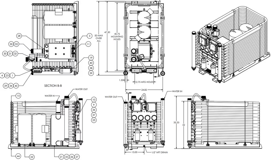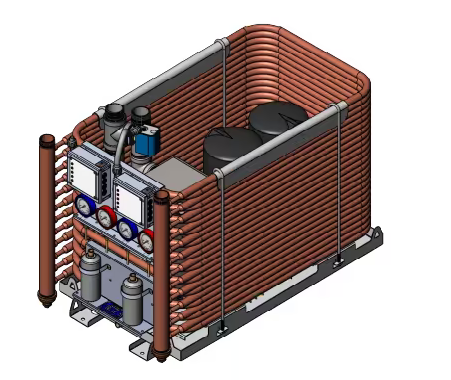 All sheet metal components are laser cut with aircraft/military quality tolerances in the ten-thousandths of an inch range as depicted here with the skeleton of an air-cooled chiller. Note the PEM nut inserts and numerous stainless steel rivets that result in a very rigid, strong, and exacting structure.
