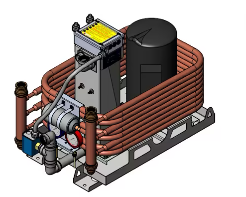 All sheet metal components are laser cut with aircraft/military quality tolerances in the ten-thousandths of an inch range as depicted here with the skeleton of an air-cooled chiller. Note the PEM nut inserts and numerous stainless steel rivets that result in a very rigid, strong, and exacting structure.