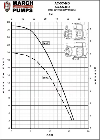 March Pump's industrial LC-5C-MD is an American submersible seal-less centrifugal magnetic drive pump. It is capable of generating a maximum flow of 15 gallons per minute at 2 feet, and its maximum head is 27 Feet (or around 11PSI).  The LC-5C-MD pump may be used submerged or not submerged. The standard wet end (the materials that come into contact with the solution) is composed of Polypropylene, Buna N, Stainless Steel, Ceramic, and Ceramic Magnet.  When submerged, Epoxy, Noryl, and the Cord are also in contact with the solution. The inlet connection is 1 inch female pipe thread, and the outlet is 1/2 inch male pipe thread. The standard motor is a 1 Phase 115V or 230V 0.125 Horsepower motor, which can be run on either 50 or 60 hertz (there are performance differences between the hertz options). Direct replacement for Dometic PML1000 115V Part Number: 225500276