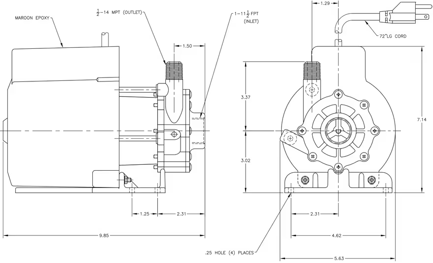 Motor is available in 115 Volt 50/60 Hz, 1 phase. 115 Volt motors have a 6 ft. (1.8 m) cord with plug. The motors are U.L. listed and rated as continuous duty.