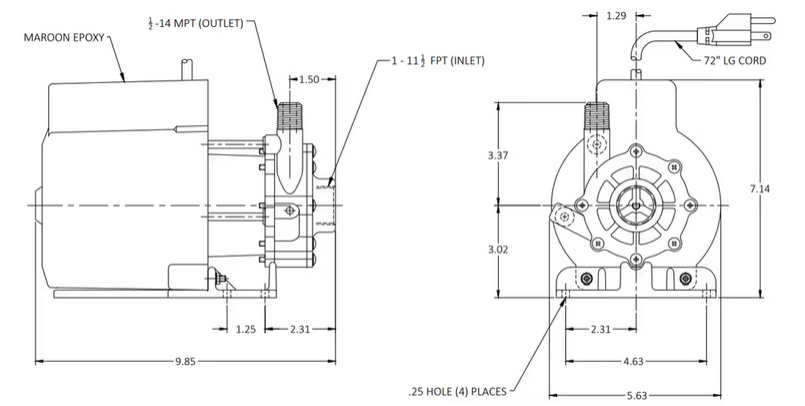 Motor is available in 115 Volt 50/60 Hz, 1 phase. 115 Volt motors have a 6 ft. (1.8 m) cord with plug. The motors are U.L. listed and rated as continuous duty.