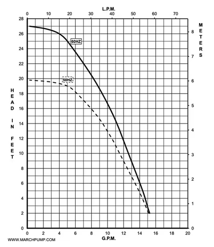 March Pump's industrial LC-5M-MD is an American submersible seal-less centrifugal magnetic drive pump. It is capable of generating a maximum flow of 15 gallons per minute at 2 feet, and its maximum head is 27 Feet (or around 11PSI).  The LC-5M-MD pump may be used submerged or not submerged. The standard wet end (the materials that come into contact with the solution) is composed of Polypropylene, Buna N, Stainless Steel, Ceramic, and Ceramic Magnet.  When submerged, Epoxy, Noryl, and the Cord are also in contact with the solution. The inlet connection is 1 inch female pipe thread, and the outlet is 1/2 inch male pipe thread. The standard motor is a 1 Phase 115V or 230V 0.125 Horsepower motor, which can be run on either 50 or 60 hertz (there are performance differences between the hertz options). Direct replacement for Dometic PML1000 115V Part Number: 225500276