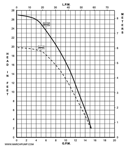 March Pump's industrial LC-5M-MD is an American submersible seal-less centrifugal magnetic drive pump. It is capable of generating a maximum flow of 15 gallons per minute at 2 feet, and its maximum head is 27 Feet (or around 11PSI). The LC-5M-MD pump may be used submerged or not submerged. The standard wet end (the materials that come into contact with the solution) is composed of Polypropylene, Buna N, Stainless Steel, Ceramic, and Ceramic Magnet. When submerged, Epoxy, Noryl, and the Cord are also in contact with the solution. The inlet connection is 1 inch female pipe thread, and the outlet is 1/2 inch male pipe thread. The standard motor is a 1 Phase 115V or 230V 0.125 Horsepower motor, which can be run on either 50 or 60 hertz (there are performance differences between the hertz options). Direct replacement for Dometic PML1000 230V Part Number: 225500288