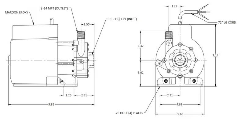 Motor is available in 230 Volt 50/60 Hz, 1 phase. 115 Volt motors have a 6 ft. (1.8 m) cord with plug. 230 V motors have a 6 ft. (1.8 m) cord with no plug. The motors are U.L. listed and rated as continuous duty.