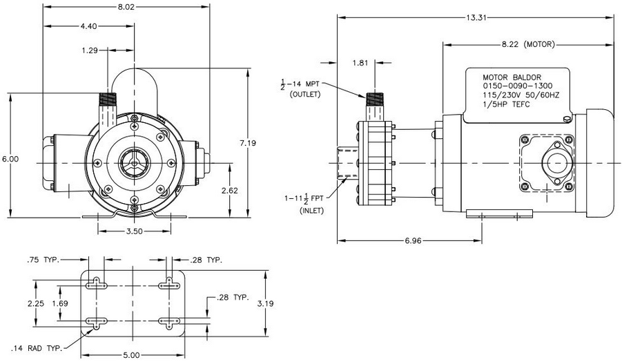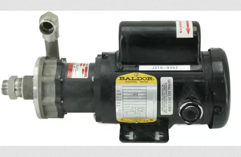 March Pump's industrial TE-5S-MD is an American seal-less centrifugal magnetic drive pump ideal for applications such as chemical recirculation, chemical transfer, and scrubber systems. It is capable of generating a maximum flow of 18 gallons per minute at 7 feet, and its maximum head is 29 Feet (or around 12PSI). The standard wet end (the materials that come into contact with the solution) is composed of 316 Stainless Steel, Viton, and Ceramic. The inlet connection is 1 inch female pipe thread, and the outlet is 1/2 inch male pipe thread. There are two standard motors. The first is a 1 Phase 60 hertz 115/230V and 50 hertz 110/220V 0.2 horsepower totally enclosed fan cooled motor. The second is a 3 Phase 60/50HZ 230/460V IEC totally enclosed 0.17 horsepower fan cooled motor.