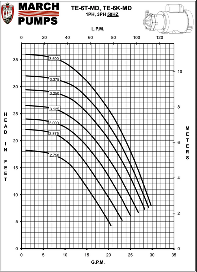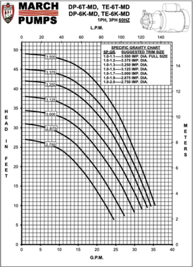 March Pump’s industrial TE-6T-MD is an American seal-less centrifugal magnetic drive pump ideal for applications such as chemical recirculation, chemical transfer, and scrubber systems. It is capable of generating a maximum flow of 38 gallons per minute at 10 feet, and its maximum head is 49 Feet (21PSI). The standard wet end (the materials that come into contact with the solution) is composed of Polypropylene, Ryton, Viton, Ryton/Teflon/Carbon, and Ceramic. The inlet connection is 1 inch female pipe thread, and the outlet is 3/4 inch male pipe thread.There are two standard motors. The first is a 1 Phase 60 hertz 115/208/230V and 50 hertz 115/230V 0.5 horsepower totally enclosed fan cooled motor. The second is a 3 Phase 60 hertz 208/230/460V and 50 hertz 190/380V 0.5 horsepower totally enclosed fan cooled motor. There are performance differences between the hertz options. The maximum internal pressure the pump can tolerate is 50PSI, and the maximum liquid temperature is 190 Fahrenheit or 87 Celsius. The March TE-6T-MD centrifugal magnetic drive pump is capable of handling mildly or highly corrosive chemicals, acids, and solvents. To determine if the March TE-6T-MD is suitable for your application, please contact March Pump.