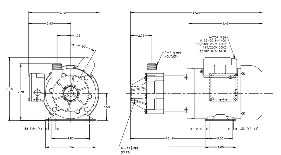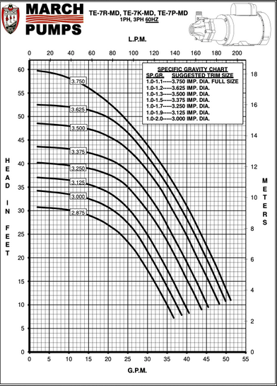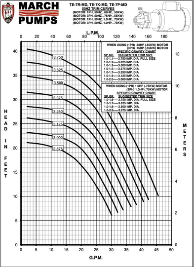 March Pump’s industrial TE-7P-MD is an American seal-less centrifugal magnetic drive pump ideal for applications such as chemical recirculation, chemical transfer, and scrubber systems. It is capable of generating a maximum flow of 53 gallons per minute at 10 feet, and its maximum head is 60 Feet (26PSI). The standard wet end (the materials that come into contact with the solution) is composed of Polypropylene, Viton, Ryton/Teflon/Carbon, and Ceramic. The inlet connection is 1-1/2 inch female pipe thread, and the outlet is 1 inch male pipe thread. There are two standard motors. The first is a 1 Phase 60 hertz 115/208/230V and 50 hertz 115/230V 0.75 horsepower totally enclosed fan cooled motor. The second is a 3 Phase 60 hertz 208/230/460V and 50 hertz 190/380V 0.75 horsepower totally enclosed fan cooled motor. There are performance differences between the hertz options. The maximum internal pressure the pump can tolerate is 50PSI, and the maximum liquid temperature is 190 Fahrenheit or 87 Celsius. The March TE-7P-MD centrifugal magnetic drive pump is capable of handling mildly or highly corrosive chemicals, acids, and solvents. To determine if the March TE-7P-MD is suitable for your application, please contact March Pump.
