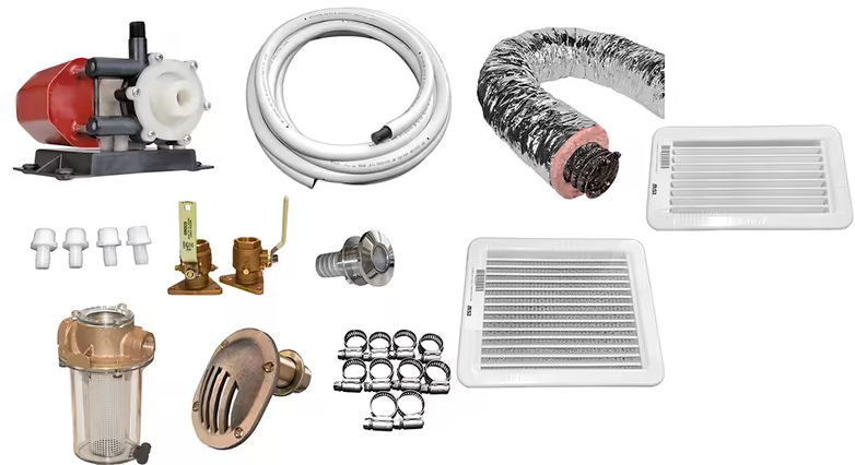 A/C Premium Installation Kit (Pump, Plastic Grills, Duct and Hardware) for Dometic ECD10, DTU10, and DTU12 Marine A/C Units.