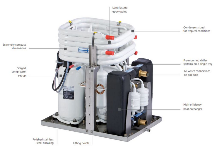 Chiller systems are suitable for boats with several cabins. Whenever three or more independent areas in a yacht need to be air-conditioned, a central chiller system is the right choice. The chiller unit is typically placed in the engine room, providing chilled water / glycol to all cabins via the chilled water circuit. One or several air handlers are fitted in each cabin providing the required cooling capacities to the rooms. The system offers one control for the unit itself as well as separate panels for each cabin.