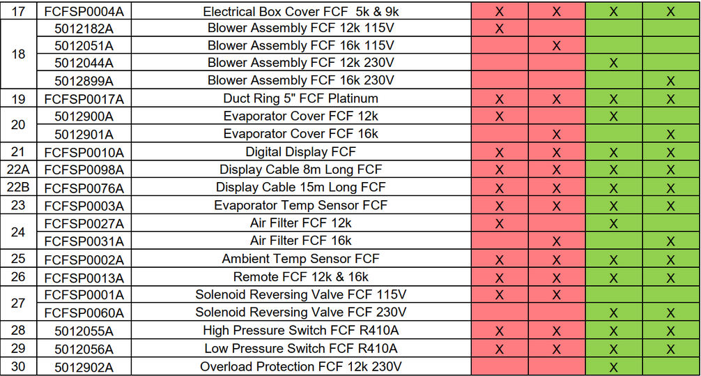 FCF Classic 12,000 BTU's Spare Parts Diagram